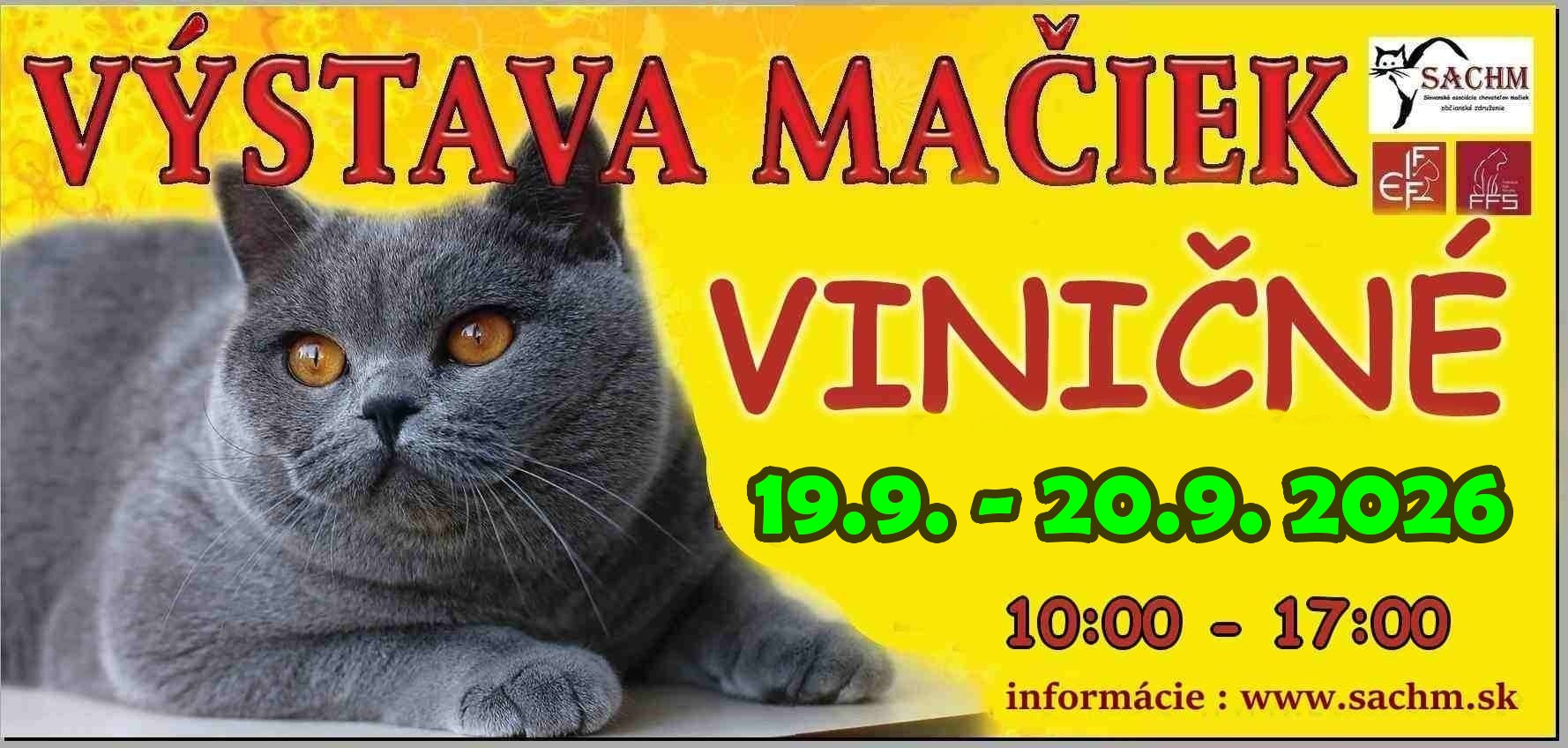 Milí vystavovatelia. Pripravili sme pre vás výstavu, na ktorej je možné počas víkendu získať 2 certifikáty pre vašu krásnu mačku. Veríme, že vás v dňoch 19. a 20. septembra poteší možnosť užiť si pohodový víkend vo Viničnom
